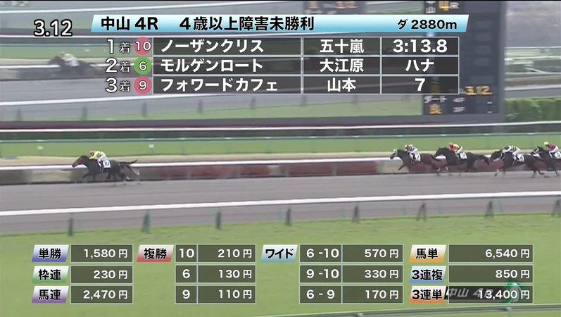 ◎クリノテルチャン(6人気)2着 複勝340円 - 4/5【中山4R】4歳以上障害未勝利