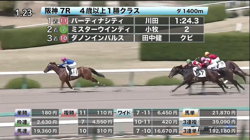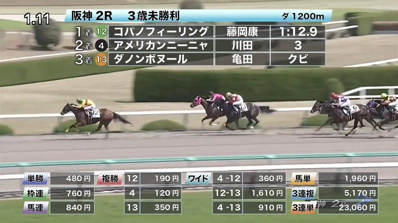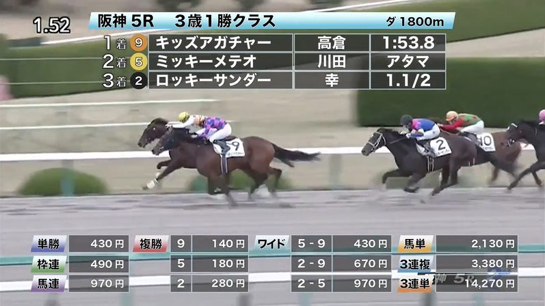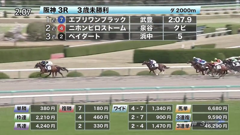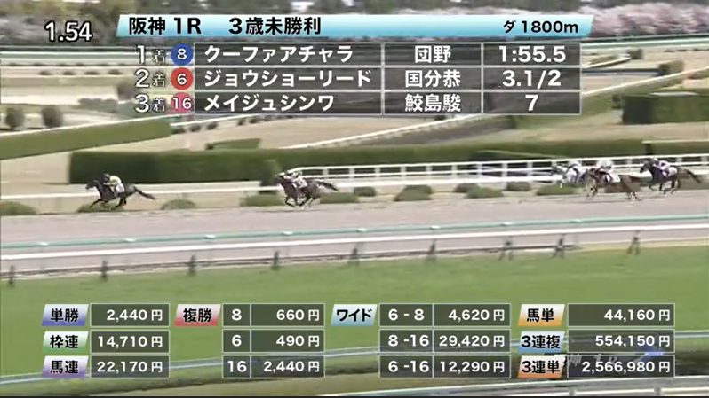 ◎タイキダイヤモンド(13人気)1着 単勝5,320円、複勝1,290円 - 4/5【阪神1R】3歳未勝利