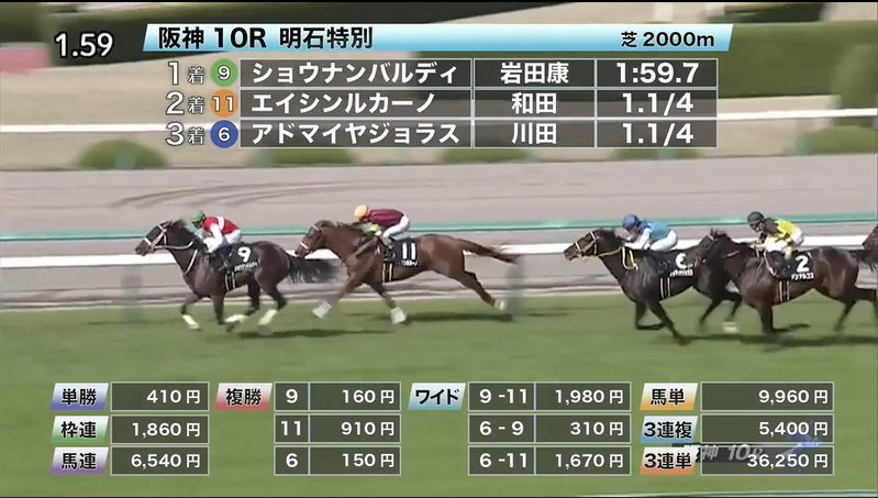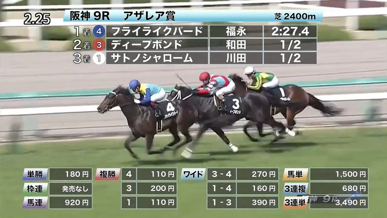 ◎ディープボンド(4人気)2着 複勝200円 - 4/4【阪神10R】明石特別