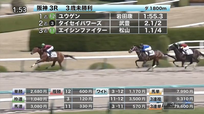 ◎ユウゲン(8人気)1着 単勝2,680円、複勝600円 - 4/5【阪神4R】3歳未勝利