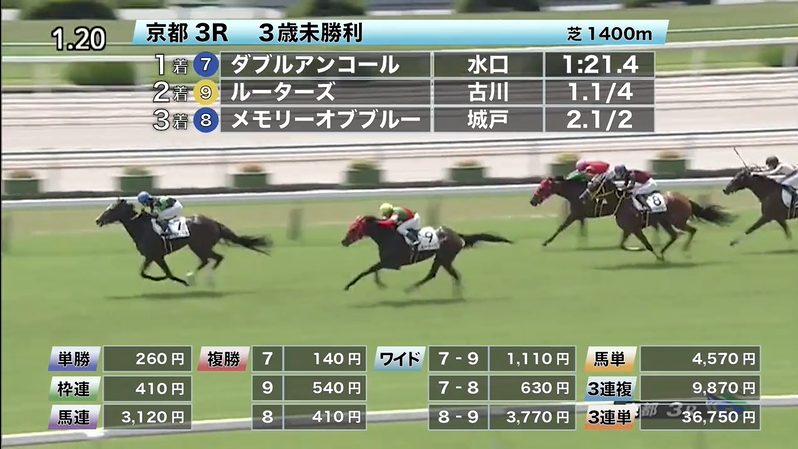 ◎メモリーオブブルー(6人気)3着 複勝410円 - 5/23【京都7R】4歳以上1勝クラス
