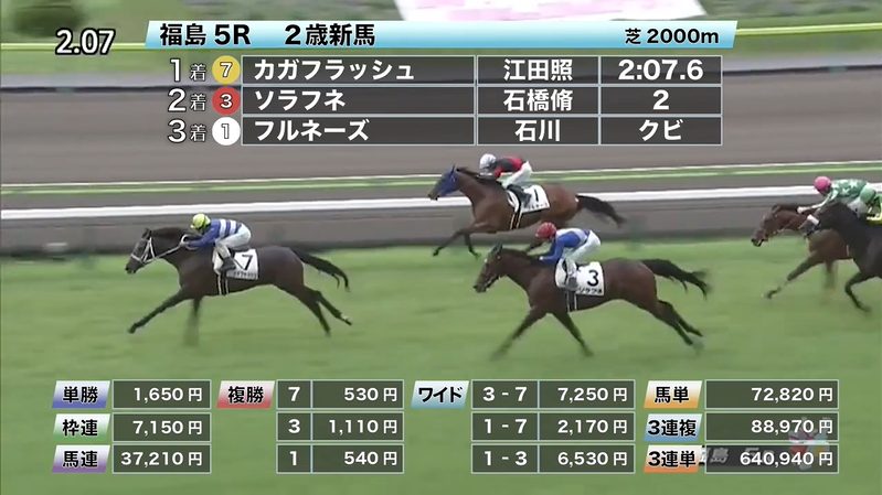◎カガフラッシュ(8人気)1着 単勝1,650円、複勝530円 - 7/12【福島7R】3歳未勝利
