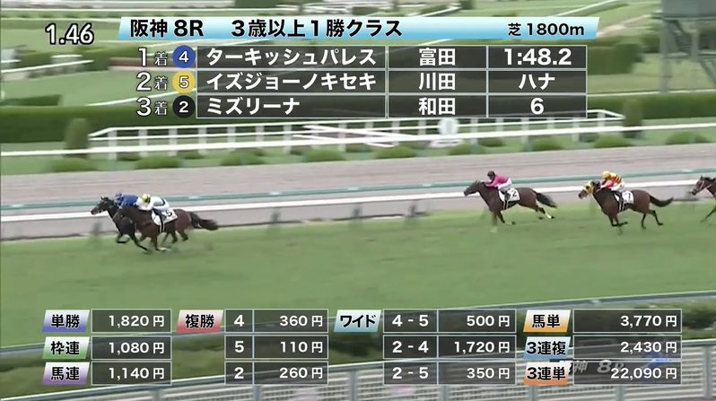 ◎ターキッシュパレス(7人気)1着 単勝1,820円、複勝360円