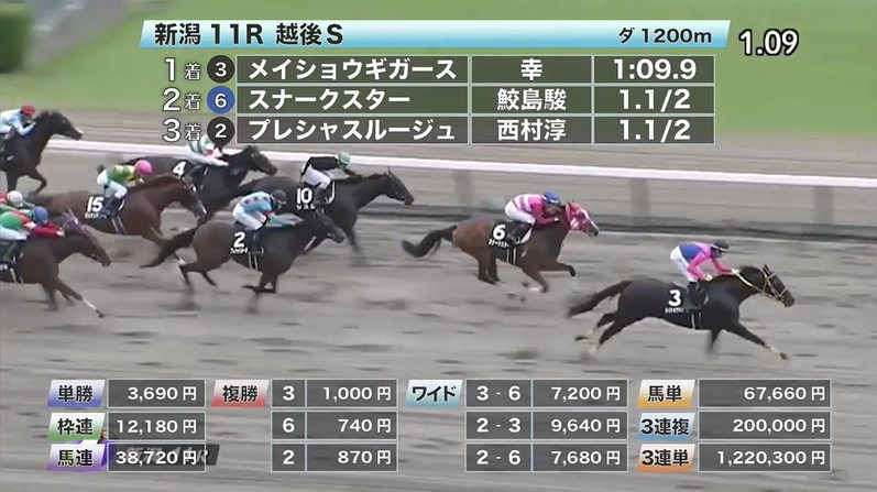 アイビスサマーダッシュは二桁人気馬をそれぞれ本命に推して惜しくも不的中となりましたが、その他会場の土日のメインレースでは、越後ステークス◎プレシャスルージュ(8番人気)3着、しらかばステークス◎ショウナンアリアナ(13番人気)3着、大雪ハンデキャップ◎シベリウス(7番人気)2着など穴馬を推奨することができました。