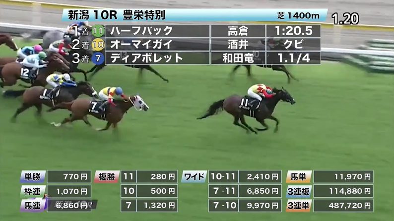 ◎ハーフバック(4人気)1着 単勝770円、複勝280円 - 7/25【新潟11R】越後ステークス