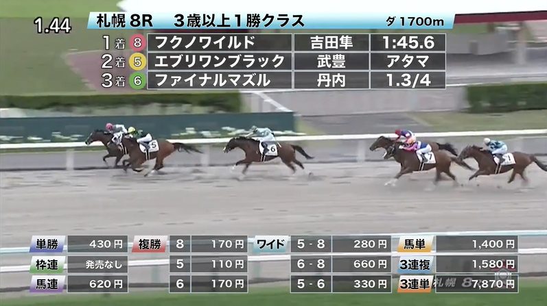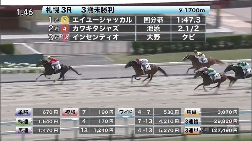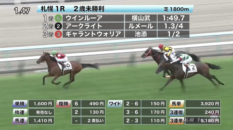 ◎ウインルーア(3人気)1着 単勝1,600円、複勝490円 - 7/25【札幌8R】3歳以上1勝クラス