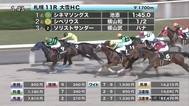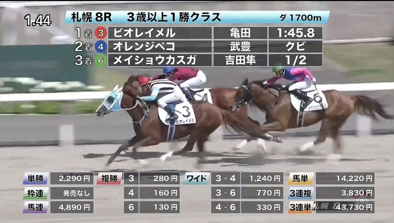◎ビオレイメル(6人気)1着 単勝2,290円、複勝280円 - 7/26【札幌11R】大雪ハンデキャップ