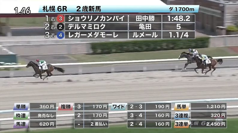 ◎デルマミロク(3人気)2着 複勝170円 - 7/26【札幌7R】3歳以上1勝クラス
