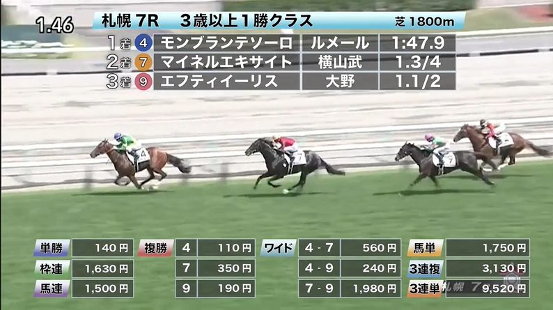 ◎マイネルエキサイト(8人気)2着 複勝350円 - 7/26【札幌8R】3歳以上1勝クラス