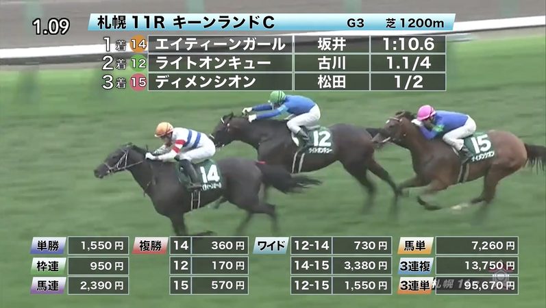 重賞では小倉サマージャンプ◎ハルキストン(8番人気)3着、キーンランドカップでは◎エイティーンガール(5番人気)1着など穴馬が好走してくれました。(新潟2歳Sは不的中)