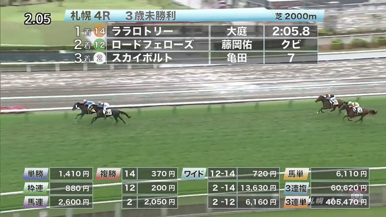 ◎ララロトリー(6人気)1着 単勝1,410円、複勝370円