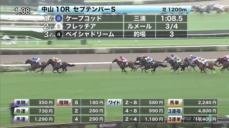 ◎ペイシャキュウ(5人気)3着 複勝420円 - 9/12【中山6R】3歳以上1勝クラス
