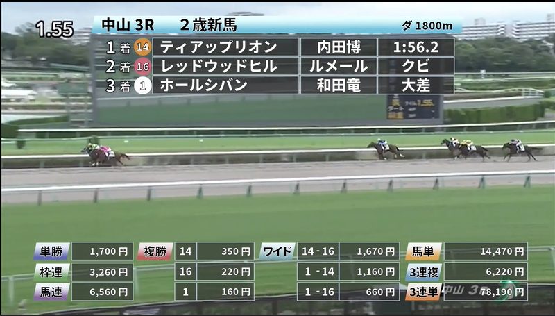◎ティアップリオン(5人気)1着 単勝1,700円、複勝350円 - 9/13【中山4R】3歳以上1勝クラス