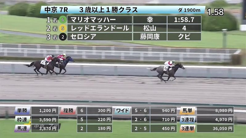 ◎マリオマッハー(5人気)1着 単勝1,200円、複勝300円
