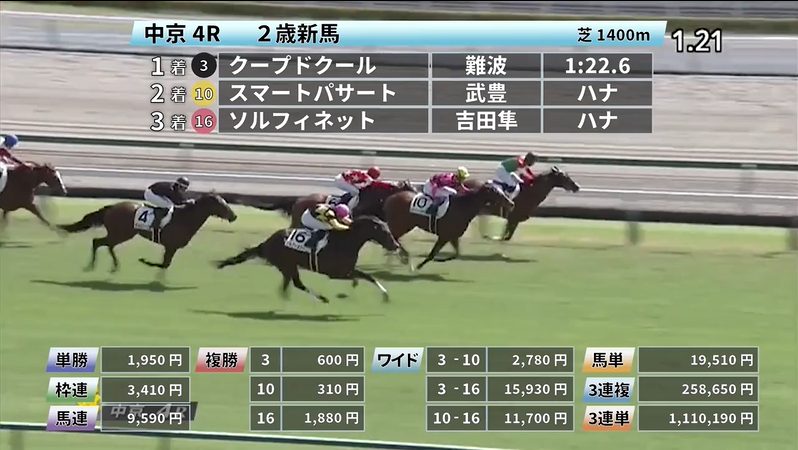 ◎クープドクール(8人気)1着 単勝1,950円、複勝600円
