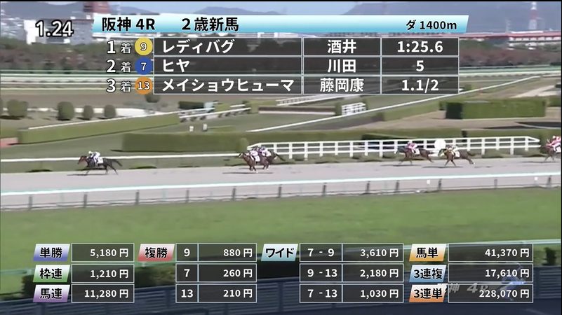 ◎レディバグ(9人気)1着 単勝5,180円、複勝880円