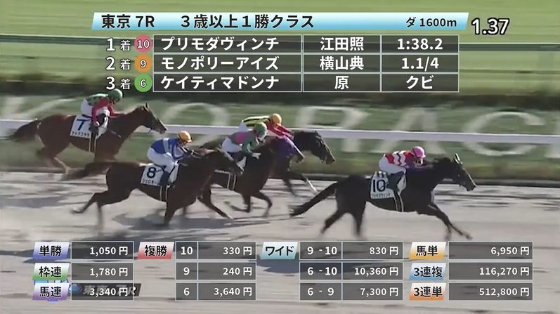 ◎プリモダヴィンチ(5人気)1着 単勝1,050円、複勝330円 - 10/31【東京9R】昇仙峡特別