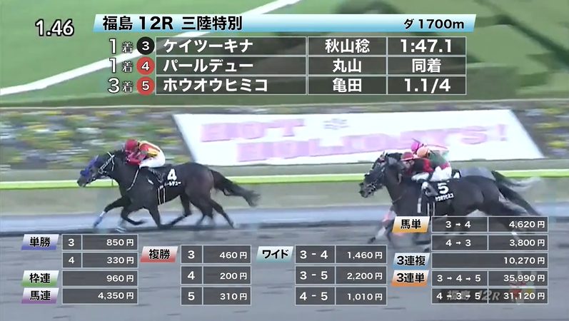 ◎ケイツーキナ(10人気)1着 単勝850円、複勝460円