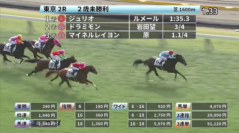 ◎イグナイター(2人気)1着 単勝480円、複勝160円 - 11/7【東京6R】2歳新馬