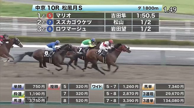 ◎マリオ(4人気)1着 単勝750円、複勝320円 - 6/5【中京12R】3歳以上2勝クラス