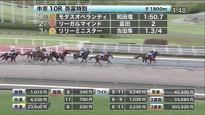 ◎モダスオペランディ(5人気)1着 単勝1,010円、複勝340円 - 6/6【中京11R】高山ステークス