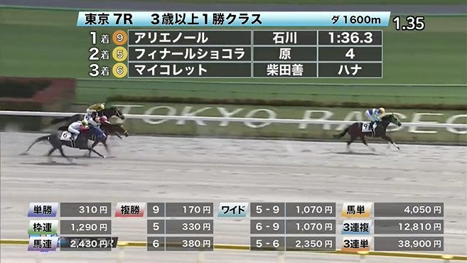 ◎アオイツヤヒメ(5人気)1着 単勝910円、複勝320円 - 6/6【東京1R】3歳未勝利