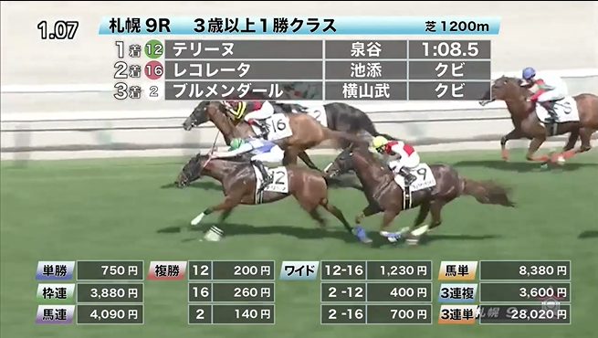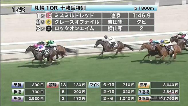 ◎テリーヌ(3人気)1着 単勝750円、複勝200円 - 6/13【札幌10R】十勝岳特別