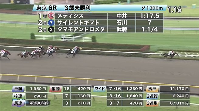 ◎メディシス(7人気)1着 単勝1,950円、複勝420円