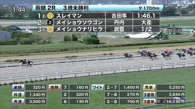 ◎メイショウソウゴン(6人気)2着 複勝320円 - 7/18【函館3R】3歳未勝利