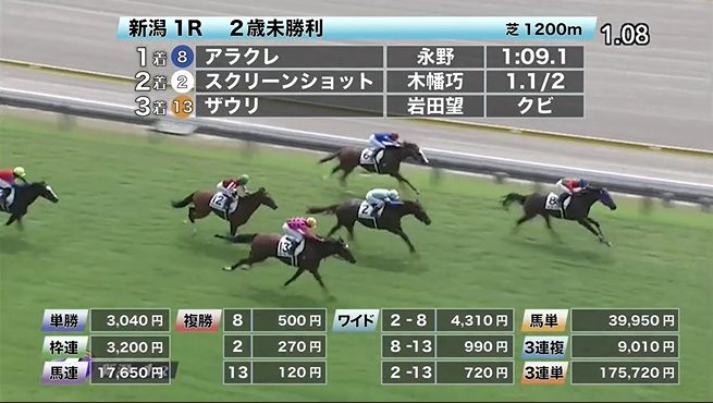 ◎アラクレ(10人気)1着 単勝3,040円、複勝500円 - 8/8【新潟3R】3歳未勝利