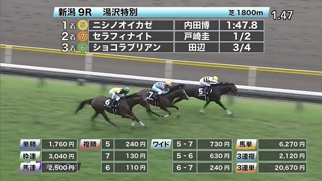 ◎ニシノオイカゼ(5人気)1着 単勝1,760円、複勝240円