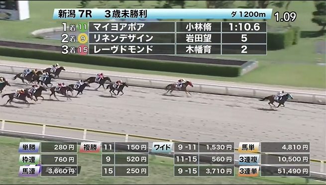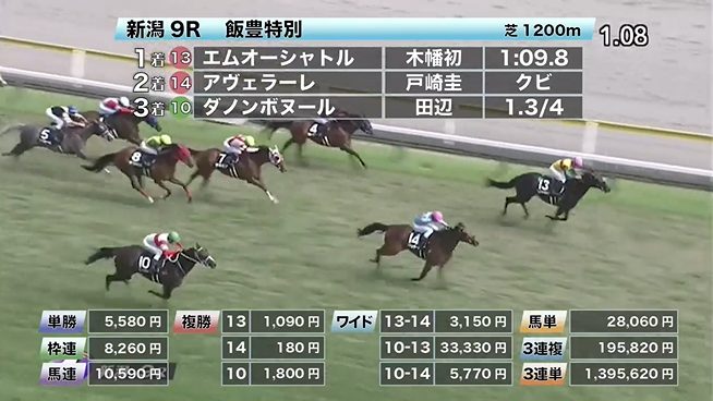 ◎エムオーシャトル(9人気)1着 単勝5,580円、複勝1,090円 - 9/5【新潟10R】両津湾特別