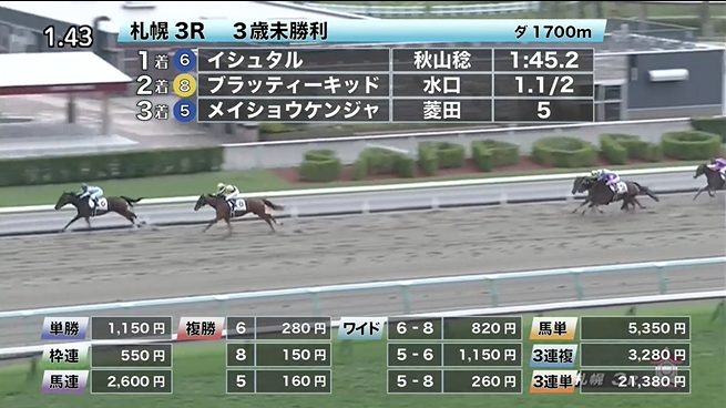 ◎イシュタル(5人気)1着 単勝1,150円、複勝280円 - 9/5【札幌5R】3歳未勝利