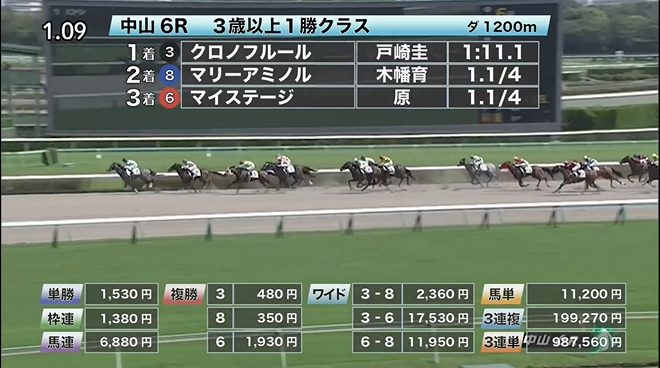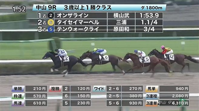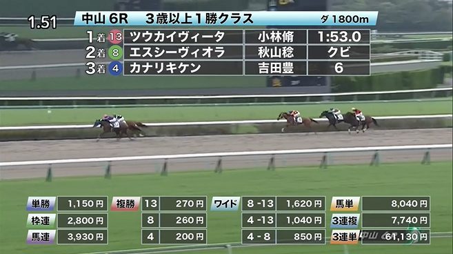 ◎ツウカイヴィータ(6人気)1着 単勝1,150円、複勝270円 - 9/12【中山7R】3歳以上1勝クラス