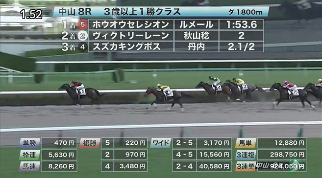 ここでは★ホウオウセレシオン(2番人気)→◎ヴィクトリーレーン(10番人気)の決着となり馬連は8,260円、ワイドは3,170円の配当となりました。