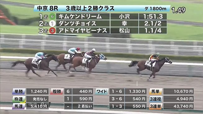 ◎キムケンドリーム(5人気)1着 単勝1,240円、複勝440円 - 9/12【中京12R】3歳以上1勝クラス