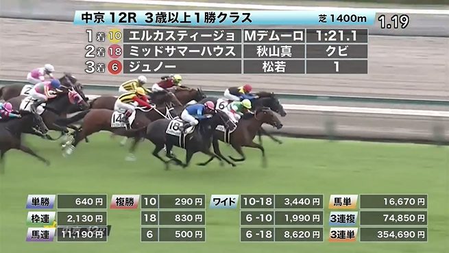 ここでは★エルカスティージョ(3番人気)→◎ミッドサマーハウス(13番人気)の決着となり馬連は11,190円、ワイドは3,440円の配当となりました。