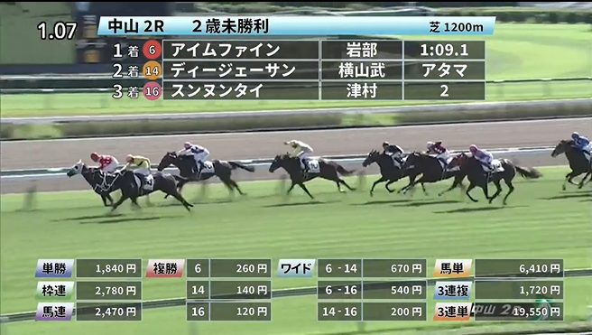 ◎アイムファイン(6人気)1着 単勝1,840円、複勝260円 - 10/2【中山4R】2歳未勝利
