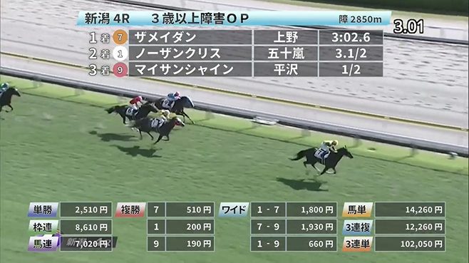 ◎サヴォワールエメ(3人気)1着 単勝1,000円、複勝360円 - 10/9【新潟4R】3歳以上障害オープン
