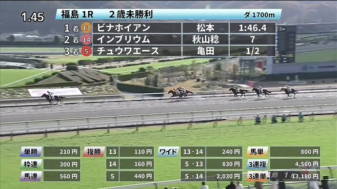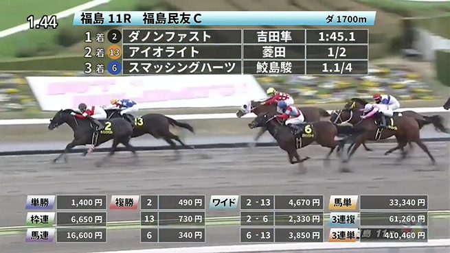 単勝的中のレースも幾つかあり、日曜福島6Rの2歳新馬では◎オリ(7番人気)1着で単勝22.3倍、日曜福島11Rの福島民友カップでは◎ダノンファスト(6番人気)1着で単勝14.0倍の穴馬が好走してくれました。