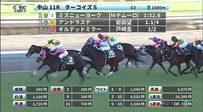 ◎ミスニューヨーク(4人気)1着 単勝680円、複勝280円