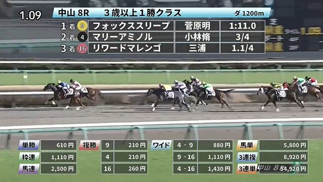 ◎マイネルトルファン(5人気)1着 単勝950円、複勝200円