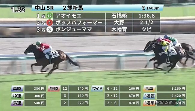 ◎グルアーブ(8人気)1着 単勝2,200円、複勝440円 - 12/12【中山3R】2歳未勝利