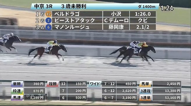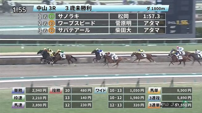 ここでは◎サノラキ(7番人気)→★ワープスピード(1番人気)→◎サパテアール(3番人気)の決着となり3連単は57,590円の配当となりました。