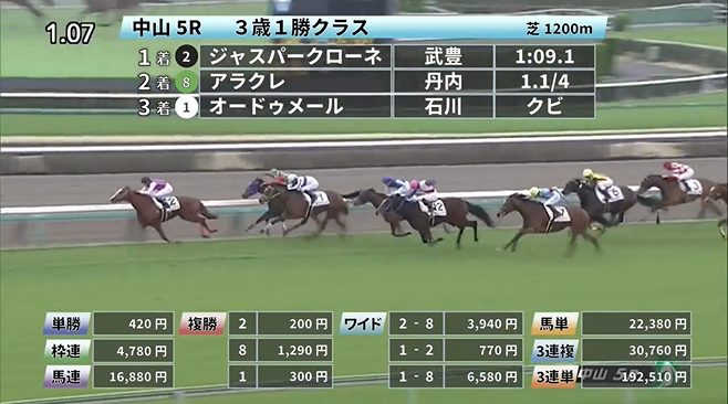 ここでは★ジャスパークローネ(3番人気)→◎アラクレ(10番人気)→◎オードゥメール(5番人気)の決着となり3連複は30,760円、3連単は192,510円の配当となりました。
