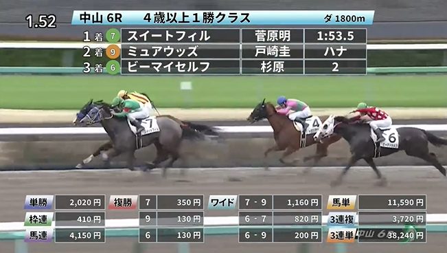 ◎スイートフィル(6人気)1着 単勝2,020円、複勝350円