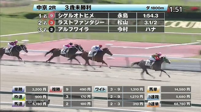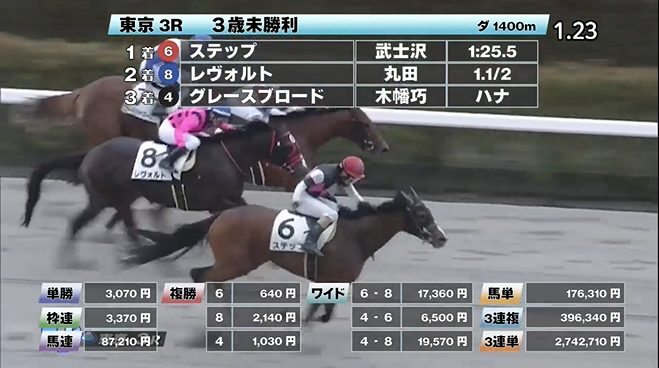 ◎ステップ(9人気)1着 単勝3,070円、複勝640円