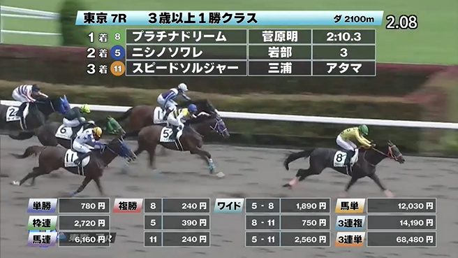 ◎プラチナドリーム(6人気)1着 単勝780円、複勝240円