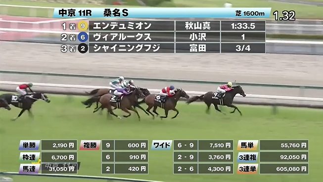 ◎エンデュミオン(9人気)1着 単勝2,190円、複勝600円