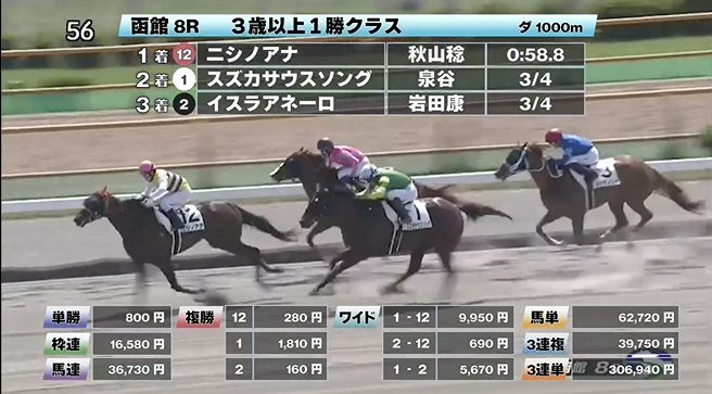 ◎ニシノアナ(5人気)1着 単勝800円、複勝280円 - 6/18【函館10R】奥尻特別